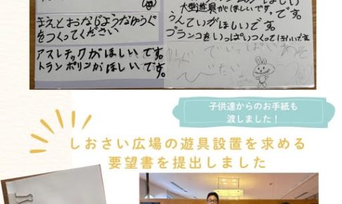 1月14日 しおさい広場の遊具設置を求める要望書とみなさんからいただいた865筆の署名、子供達からの手紙を杉本市長に届けました。 杉本市長から『みんなが署名集めや頑張っている話を聞いて、担当部課長に遊具設置するよう指示を…