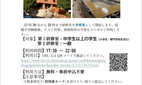 図書館内にある研修室が学習室として解放されることになりました!! 2月24日からスタートです。 17:30〜22:00 3階事務所で利用者カードを受け取っての利用となるそうです!!利用できる日の確認はホームページかQRコ…