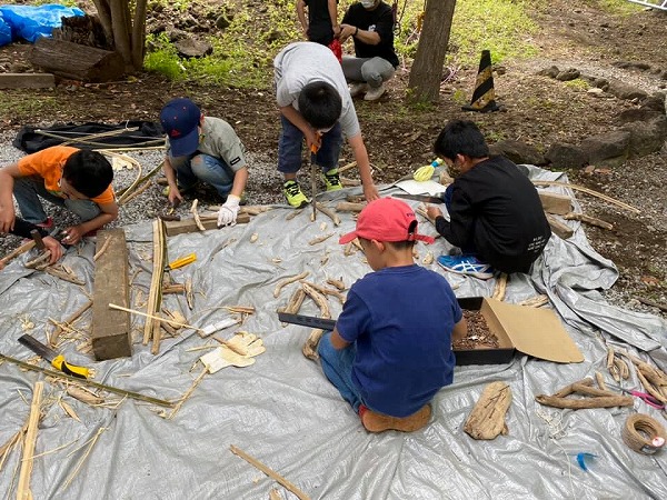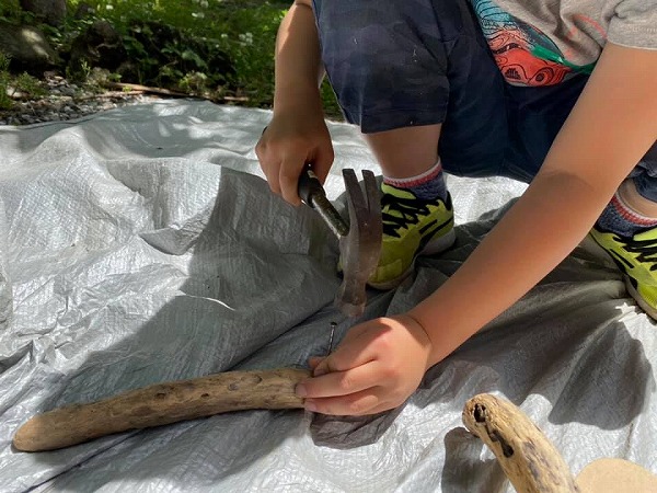 昨日は竹を自分たちでノコギリで切ってセミぶえを作ったり、流木を組み合わせて釘をうちつけたり、木登り、竹馬、弓矢作り。自分の好きな事を色々体験して遊んでいました。