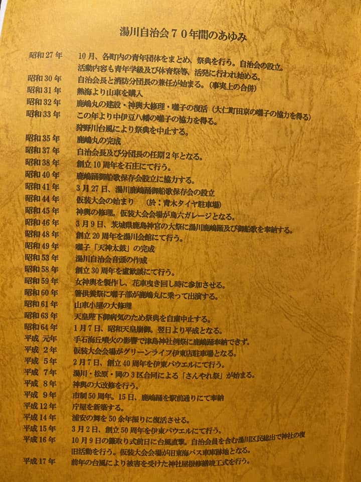 湯川自治会は戦後からの復興を果たす混乱した社会情勢の中、もともとあった『若い衆組』が新しい時代を築くための組織として発足したそうです。