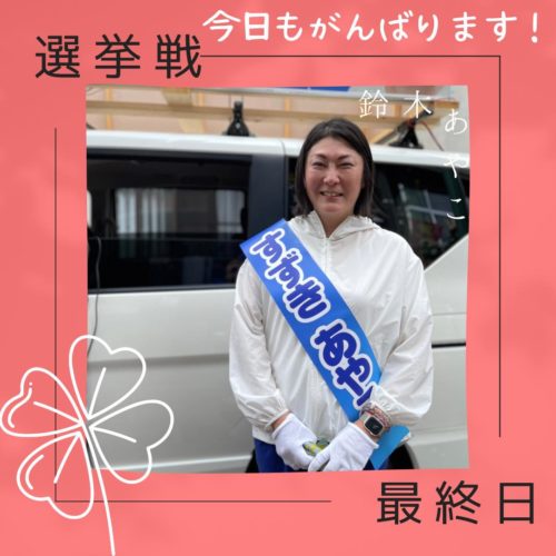 選挙2023.09.23 2024.04.25 arigato 【伊東市議会議員選挙 最終日】 ポスト シェア はてブ 送る Pocket おはようございます。 連日お騒がせして申し訳ありません。 あと1日、どうぞお許しください。 鈴木あやこ、皆様の想いをしっかり拾い、しっかり届け、そして形にしていきます! 住みやすいまちづくり、選んでもらえるまちづくり。 今の現状に沿った、想いに沿った、質の高いまちづくりをしていかなくては変わりません。 また4年間、そんな活動が出来るよう選挙戦最終日も頑張ります! ポスト シェア はてブ 送る Pocket feedly