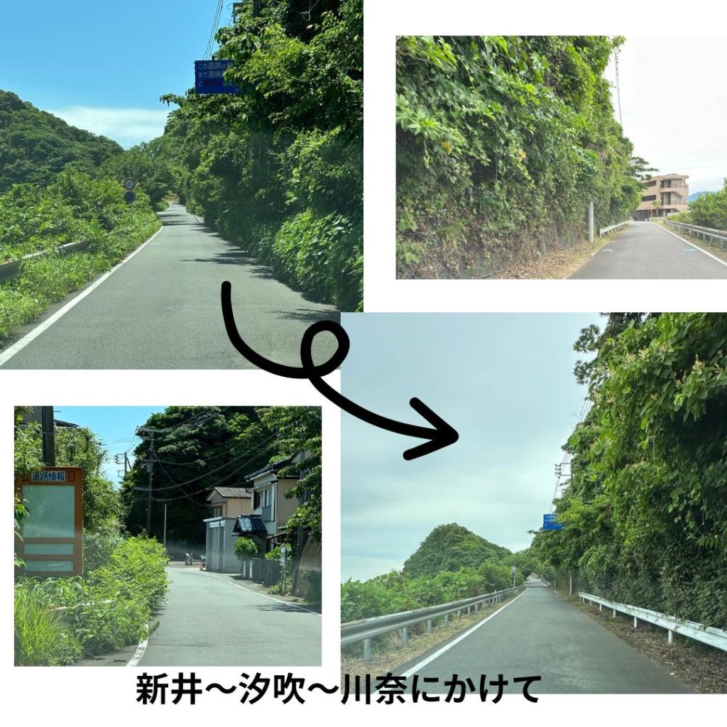 新井から汐吹を抜けて川奈に行く道は、とても狭いですがあまりに雑草がひどく、前から来る車も見づらく、対向車とすれ違うのも怖くて、大変危険でした。