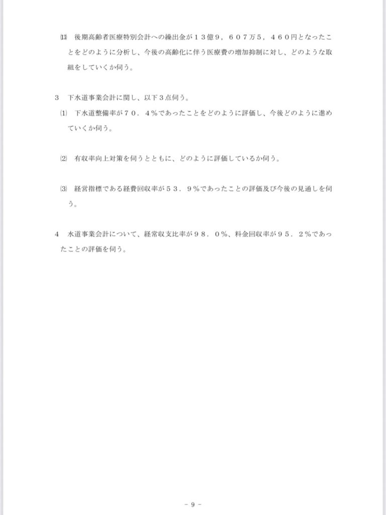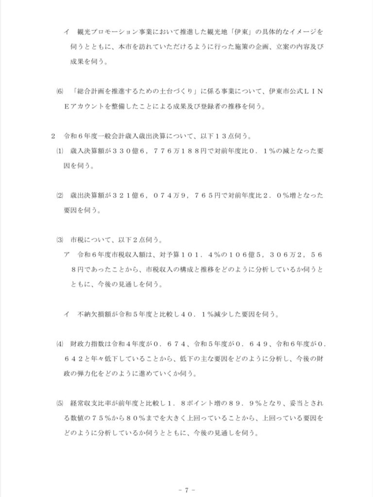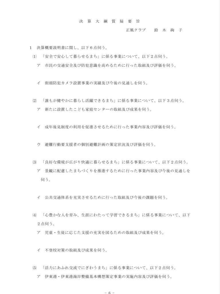 市議の活動報告2025.11.21 2025.12.26 arigato 今日から12月議会がスタートします。 ポスト シェア はてブ 送る Pocket おはようございます。 今日から12月議会がスタートします。 今日と25日は令和6年度の決算に対する大綱質疑があります。 【質疑(しつぎ)とは?】 提出された議案・決算・報告などの内容を確認するもの 自分の意見を述べるのではなく、事実・趣旨の確認をする。 決算を審査するために、ちゃんと事業が執行できたのか、どういったことをすすめたのか、各会派の代表が持ち時間内で質疑していきます。 私は本日1時から80分間やらせていただきます。 質疑は写真の内容となります。 しっかり聞いてまいります! #伊東 #伊東市議会議員 #鈴木あやこ ポスト シェア はてブ 送る Pocket feedly