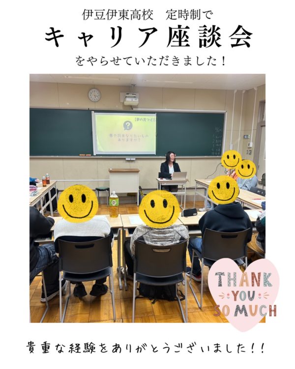 伊東あれこれ2025.12.05 2026.01.06 arigato 伊豆伊東高校の定時制学校でキャリア座談会を行いました! ポスト シェア はてブ 送る Pocket 昨日、議会運営委員会を傍聴、総合計画審議会に出席後、伊豆伊東高校の定時制学校でキャリア座談会を行いました! ここ数年、伊東商工会議所青年部のメンバーから各学年に1人ずつ選出され、キャリア座談会を行なっています。 私は初めての体験となりました。 特別な知識があるわけでもなく、ただみんなより長く生きてきたから伝えたい。 経験してきて気付いた大切なことをお話しさせていただきました。 80分と長い時間、休憩も取らずにお付き合い頂きありがとうございました!! #伊東 #キャリア座談会 #鈴木あやこ ポスト シェア はてブ 送る Pocket feedly