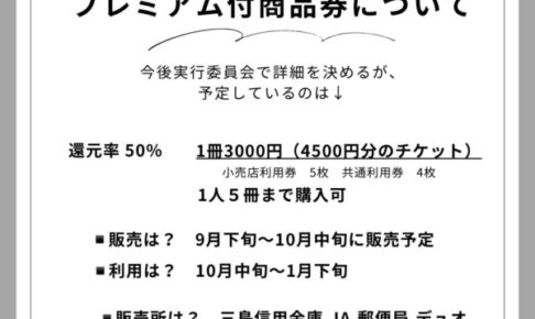 6月議会の補正予算にあがったプレミアム商品券の詳細をアップします。 これから検討委員会で検討して決定するとの事ですが、現時点で予定している内容はこちらになります。↑ また購入は完全予約販売を考えていて、WEBや広報などに…
