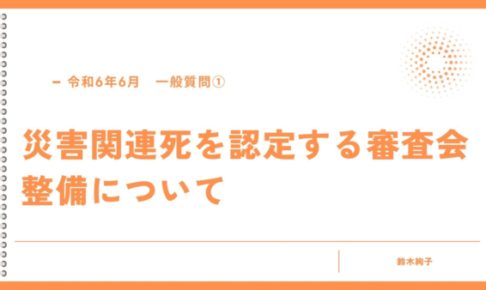一般質問の内容をまとめました。 まずは1点目の災害関連死の審査会設置についてです。 今後、医師会などの関連機関と協議し、出来るだけ早く整備出来るよう努めていく。との事でした。 是非早急に検討していただきたいと思います。 …