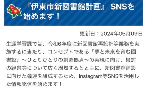 伊東市新図書館計画について情報を発信するInstagram、facebookが立ち上がりました。 どんな計画なのか、今はどのような流れで、今後どうなっていくのか。ちゃんと注視していかなくてはいけないです。 市のホームペー…