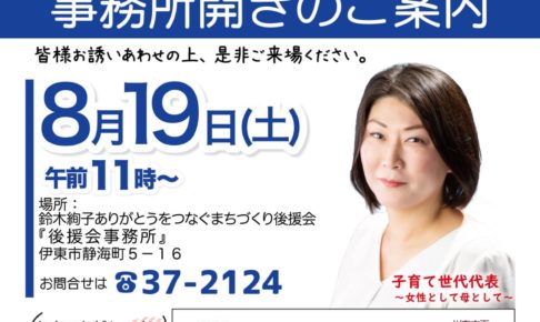 8月19日午前11時より鈴木絢子後援会の事務所開きを開催していただく事となりました。 いつも皆様には感謝でいっぱいです。 今後も女性として、母として、一市民として声を届けていけるように、けじめの一歩を踏み出したいと思いま…